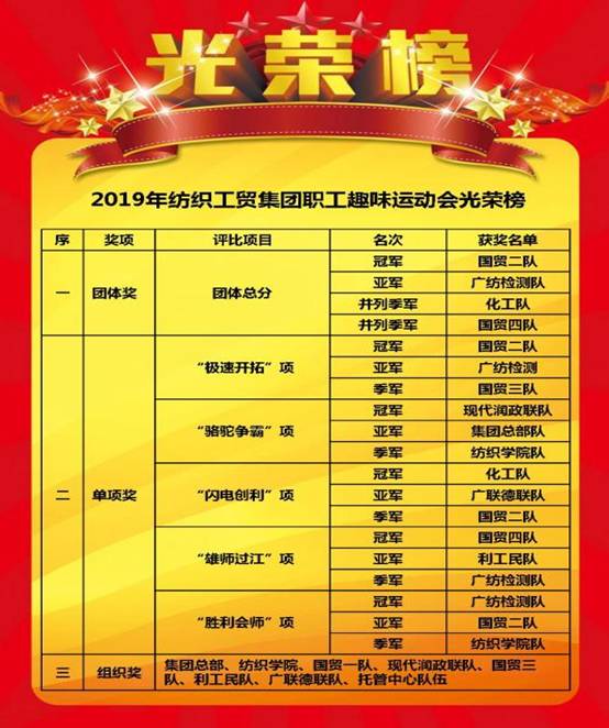 经过紧张激烈的几轮比拼后,国贸二队、广纺检测队、广州化工队和国贸四队分别荣获团体总分冠、亚、季军(并列);国贸二队、现代润政联队、广州化工队、国贸四队、广纺检测队等代表队喜摘5个单项冠军;集团总部队等8支队伍获得优秀组织奖。(详细获奖名单见文末光荣榜)